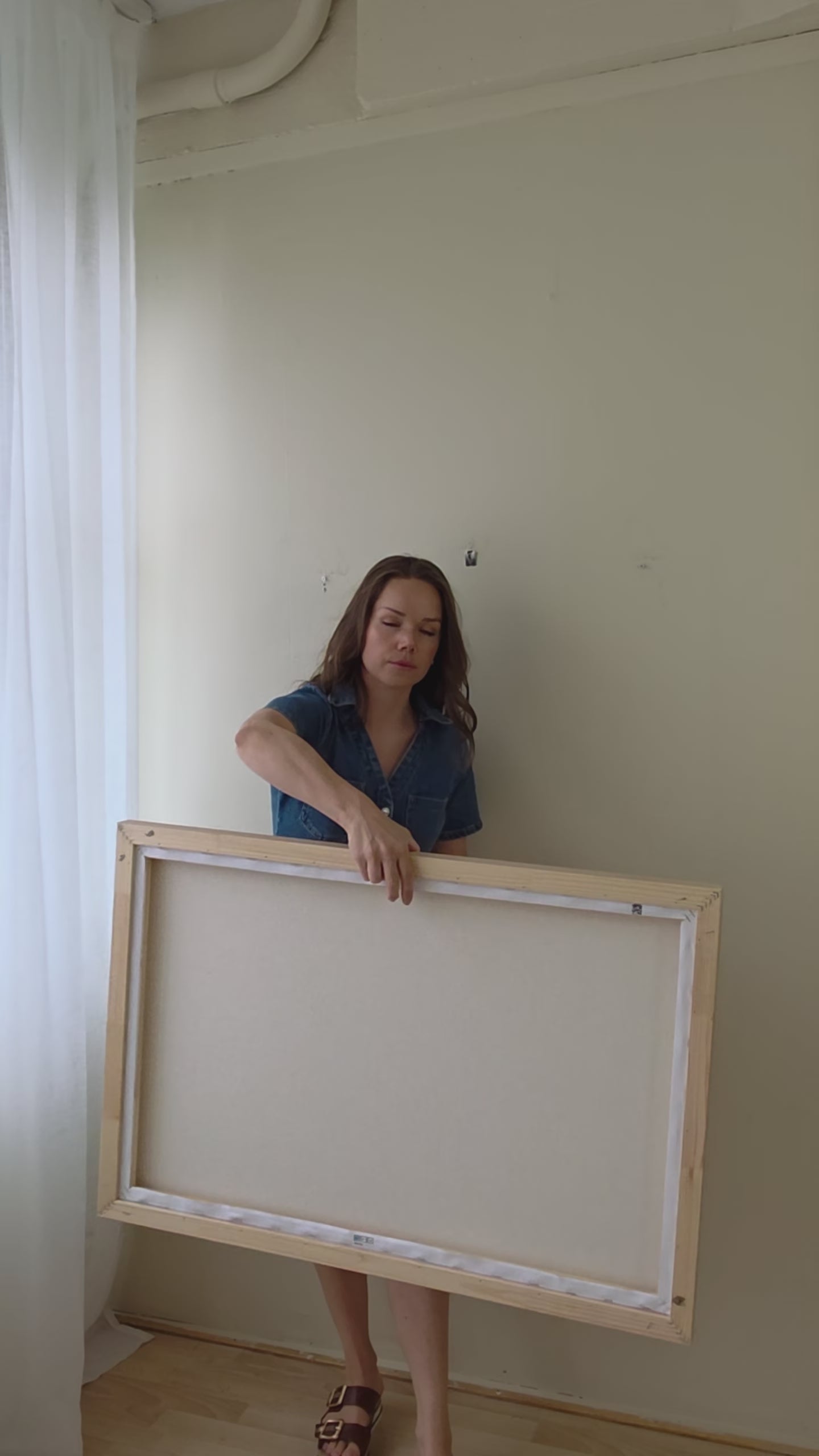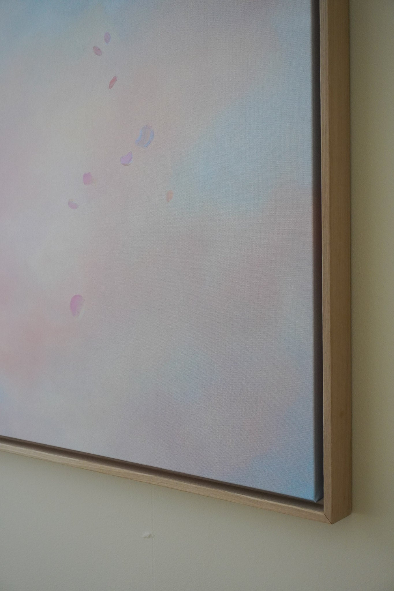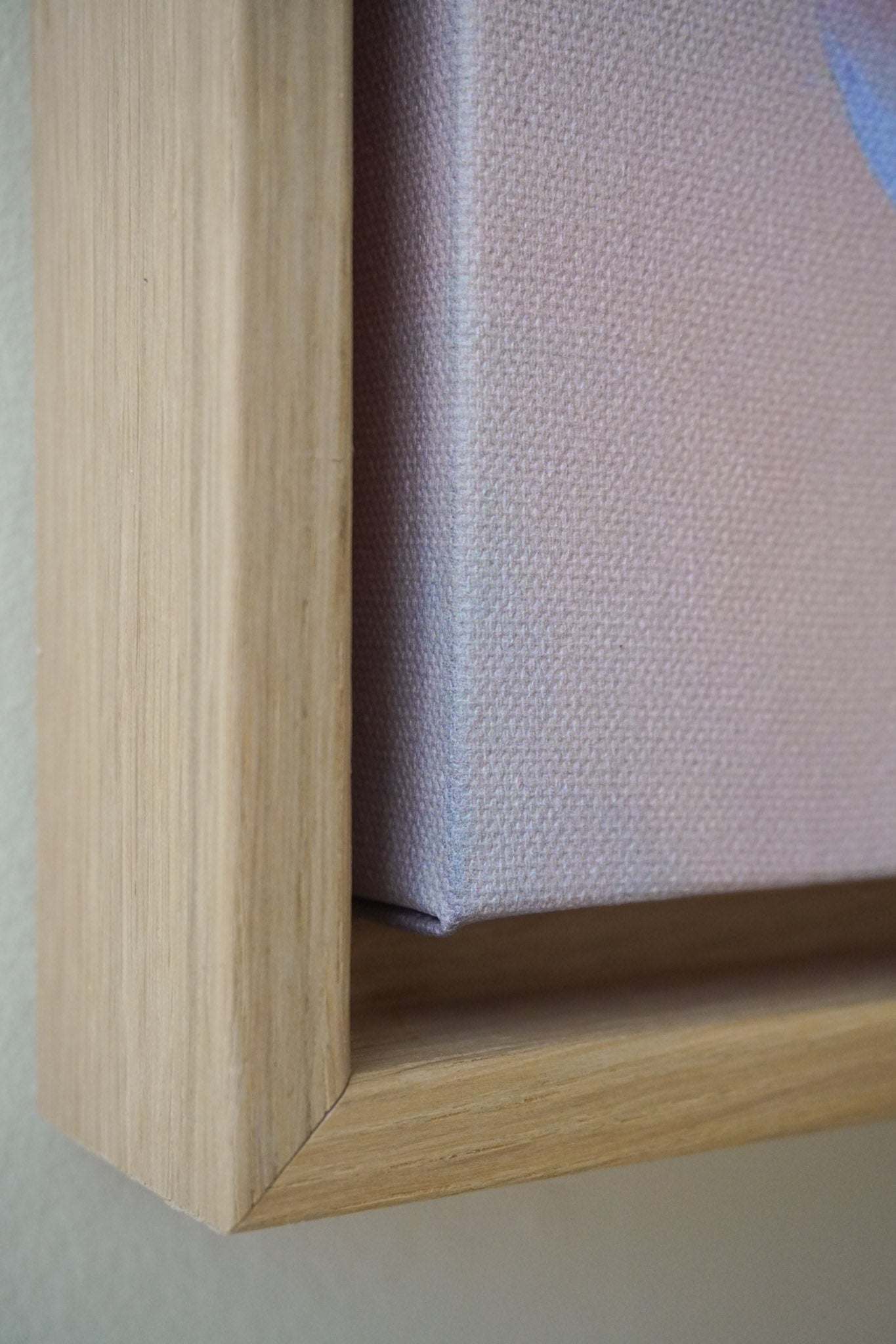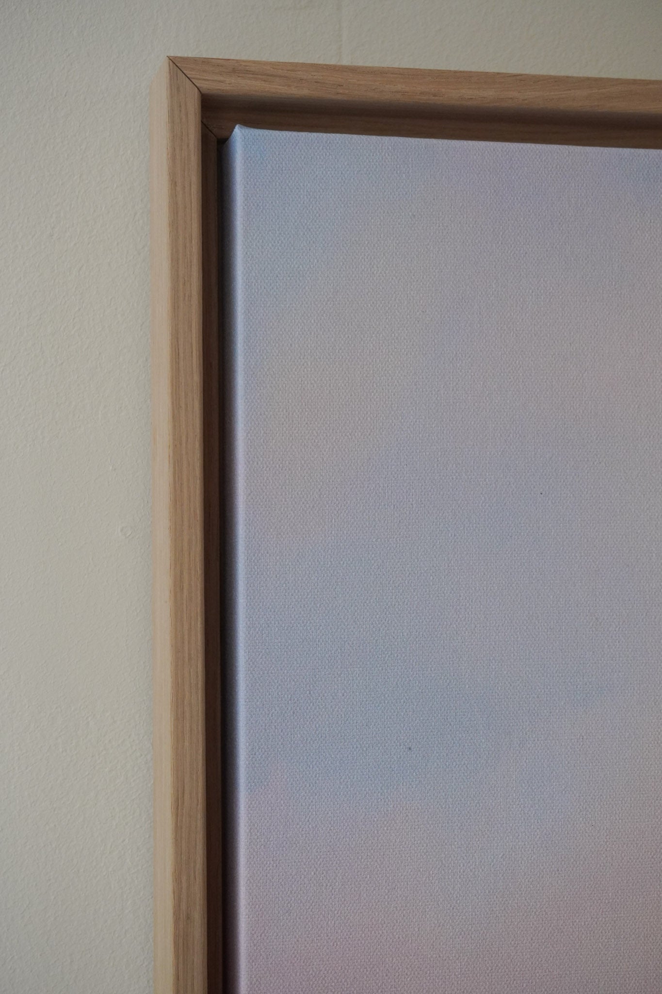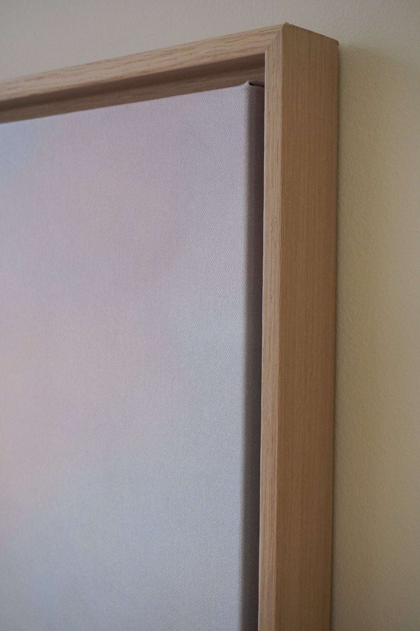 The floater frames are 3,2 cm deep. The oak frame is made from solid wood with oak veneer on top. The floating frame gives your canvas the appearance of floating within the frame.