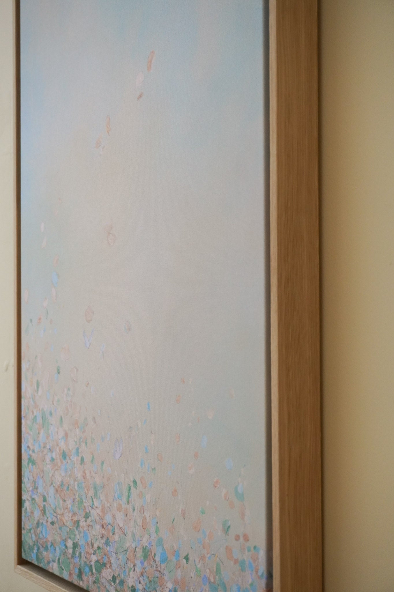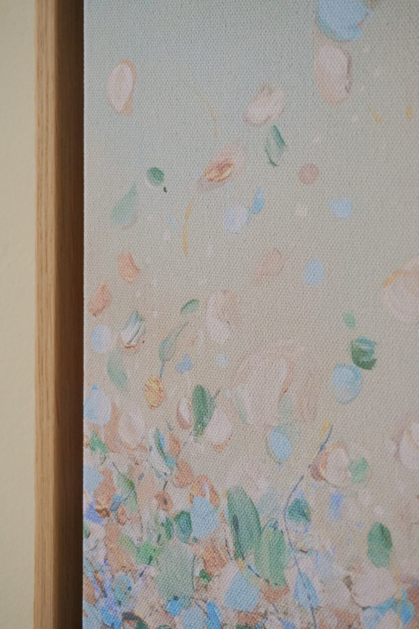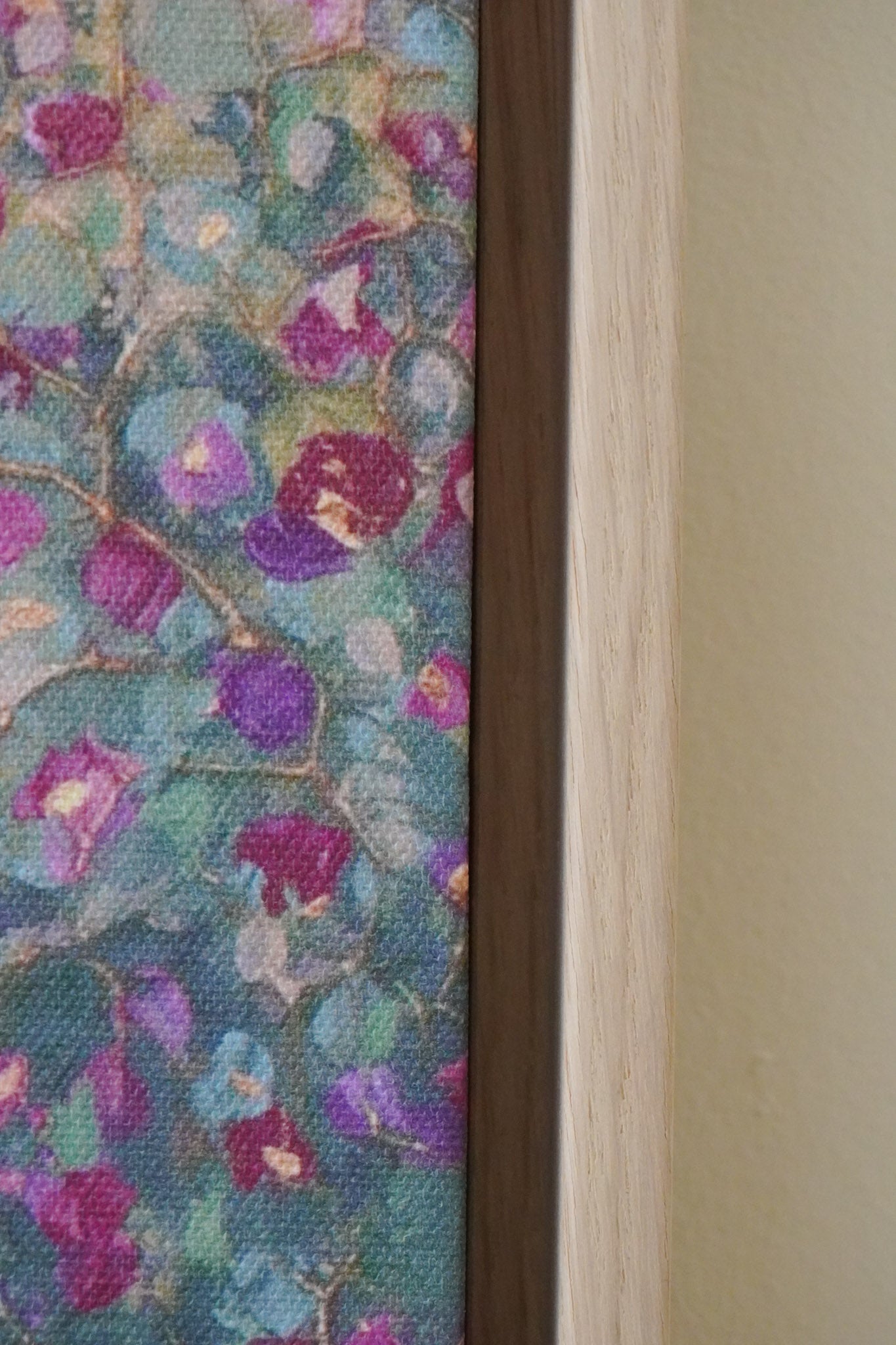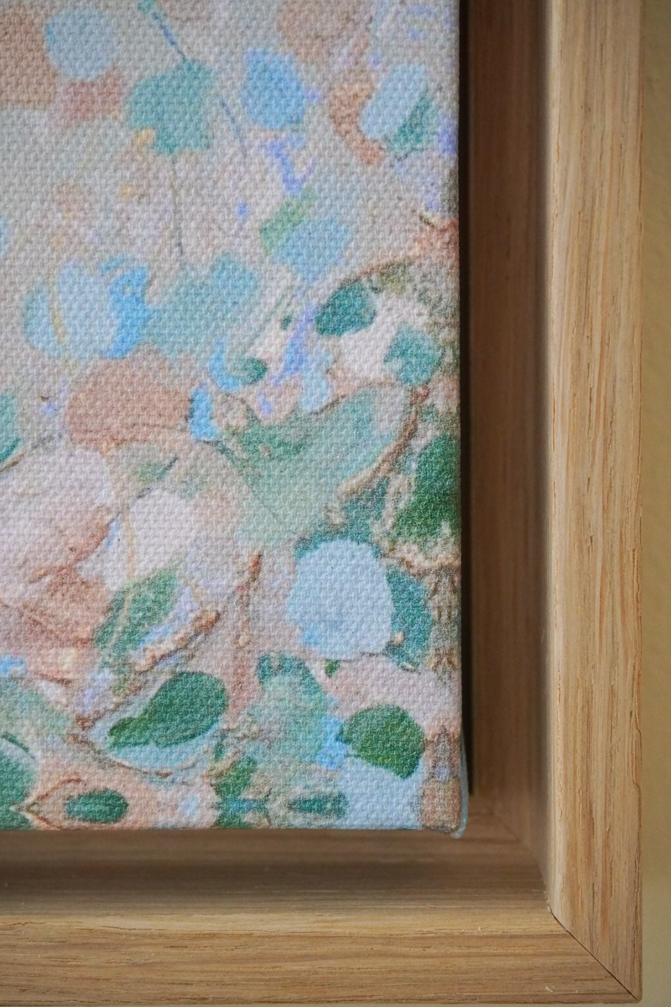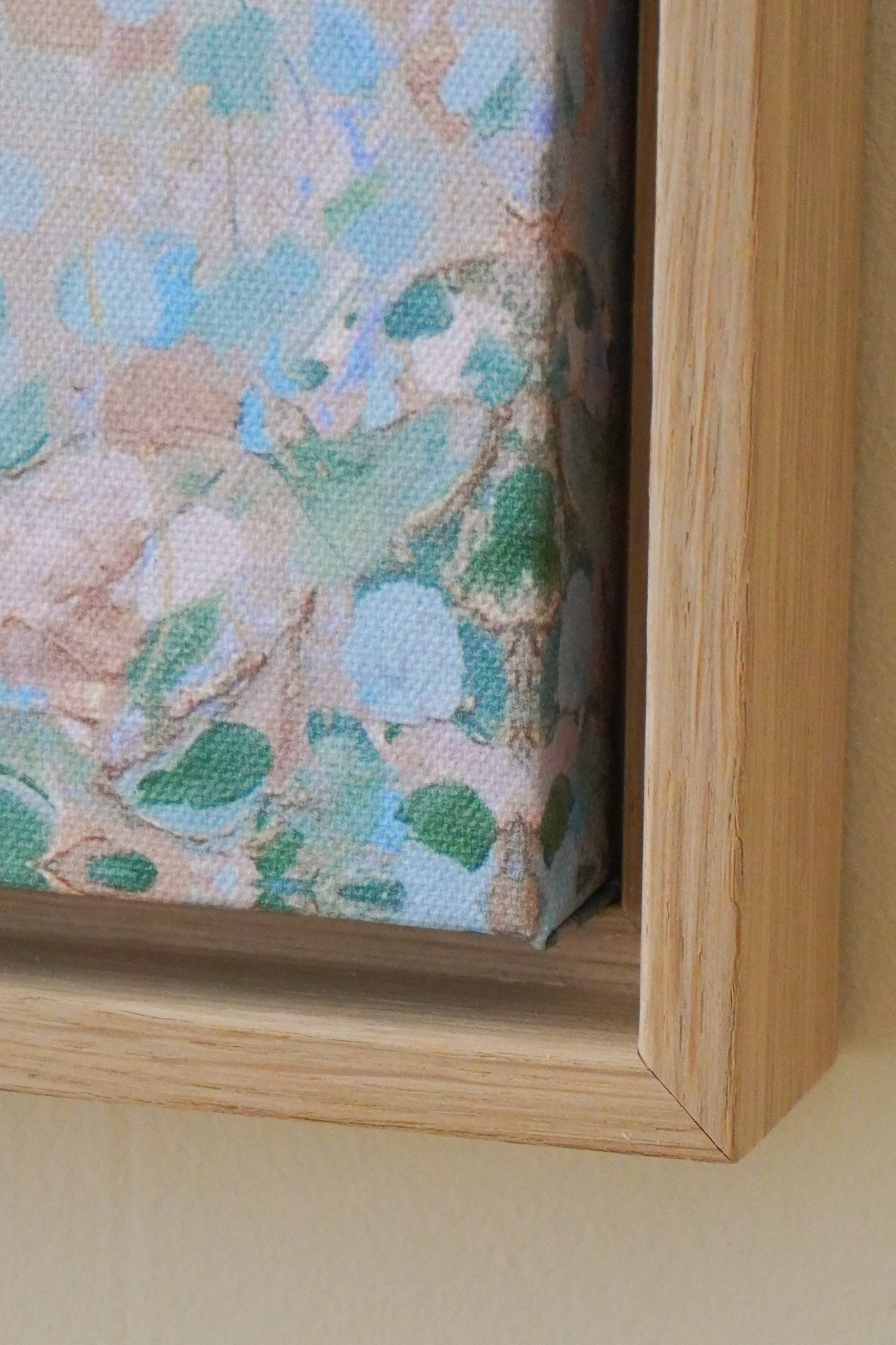 The edges of the canvas are mirrored. I highly recommend getting it with a floating frame, which will give the print an elevated, gallery-style appearance. The print “floats” inside a shadow gap frame, available in black, white, or oak. The oak frames are a beautiful oak veneer on solid wood. Everything arrives fully assembled and ready to hang on a sawtooth hanger.