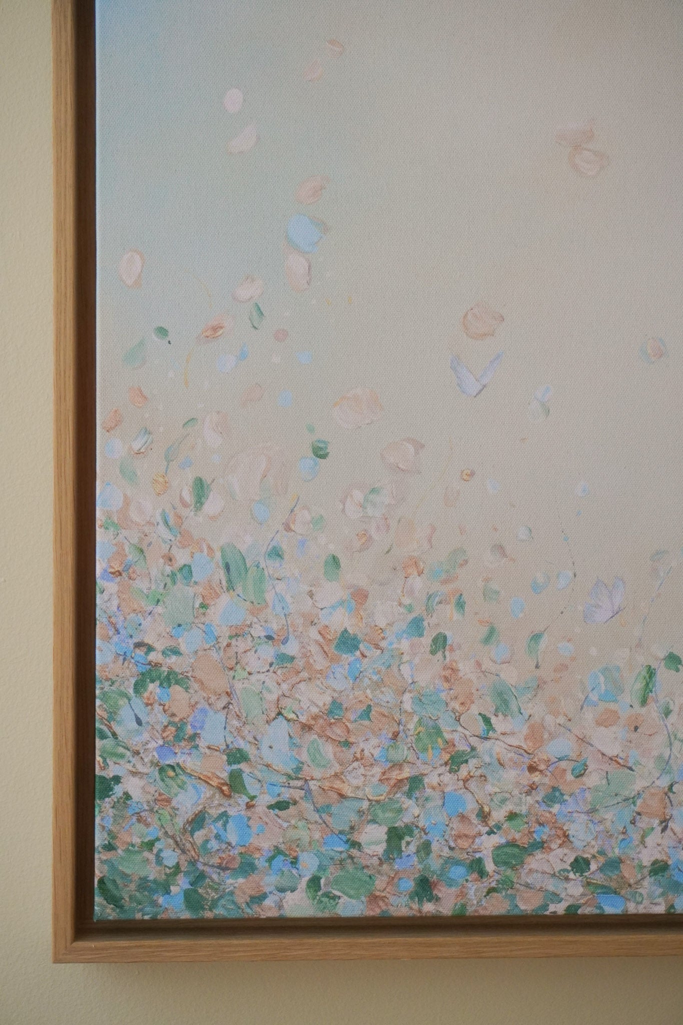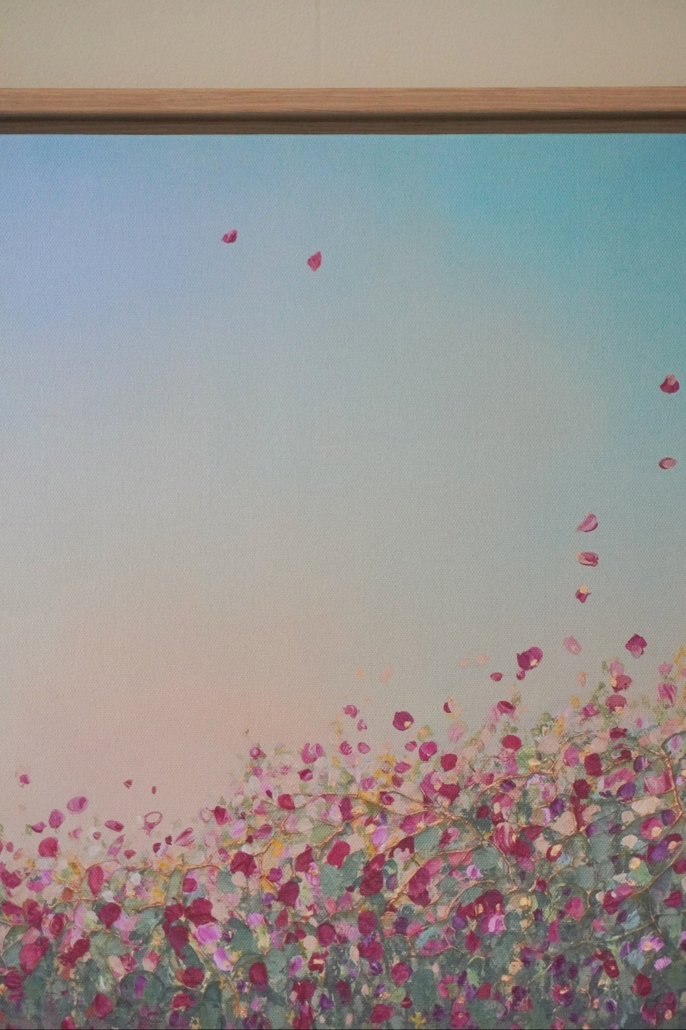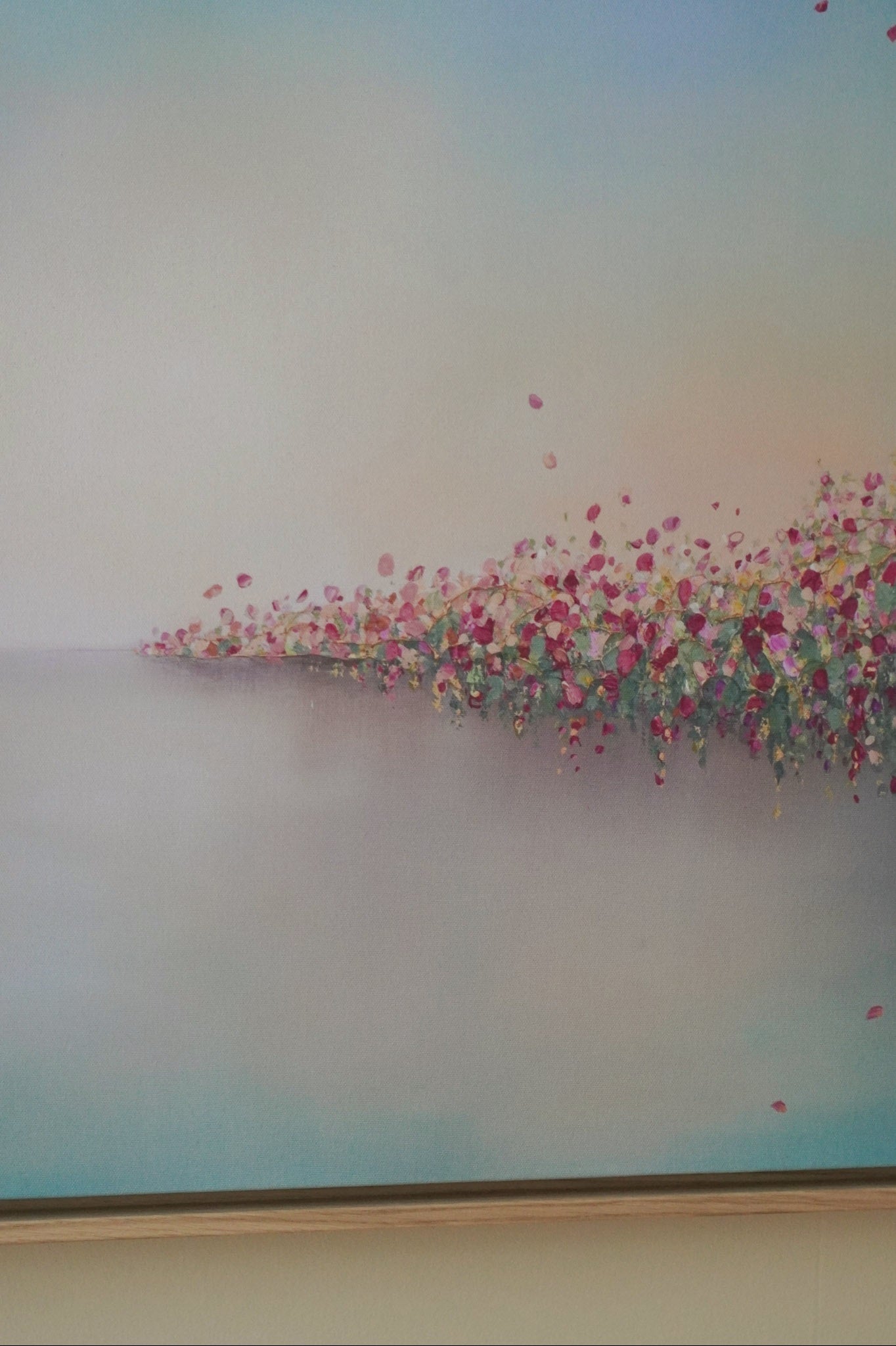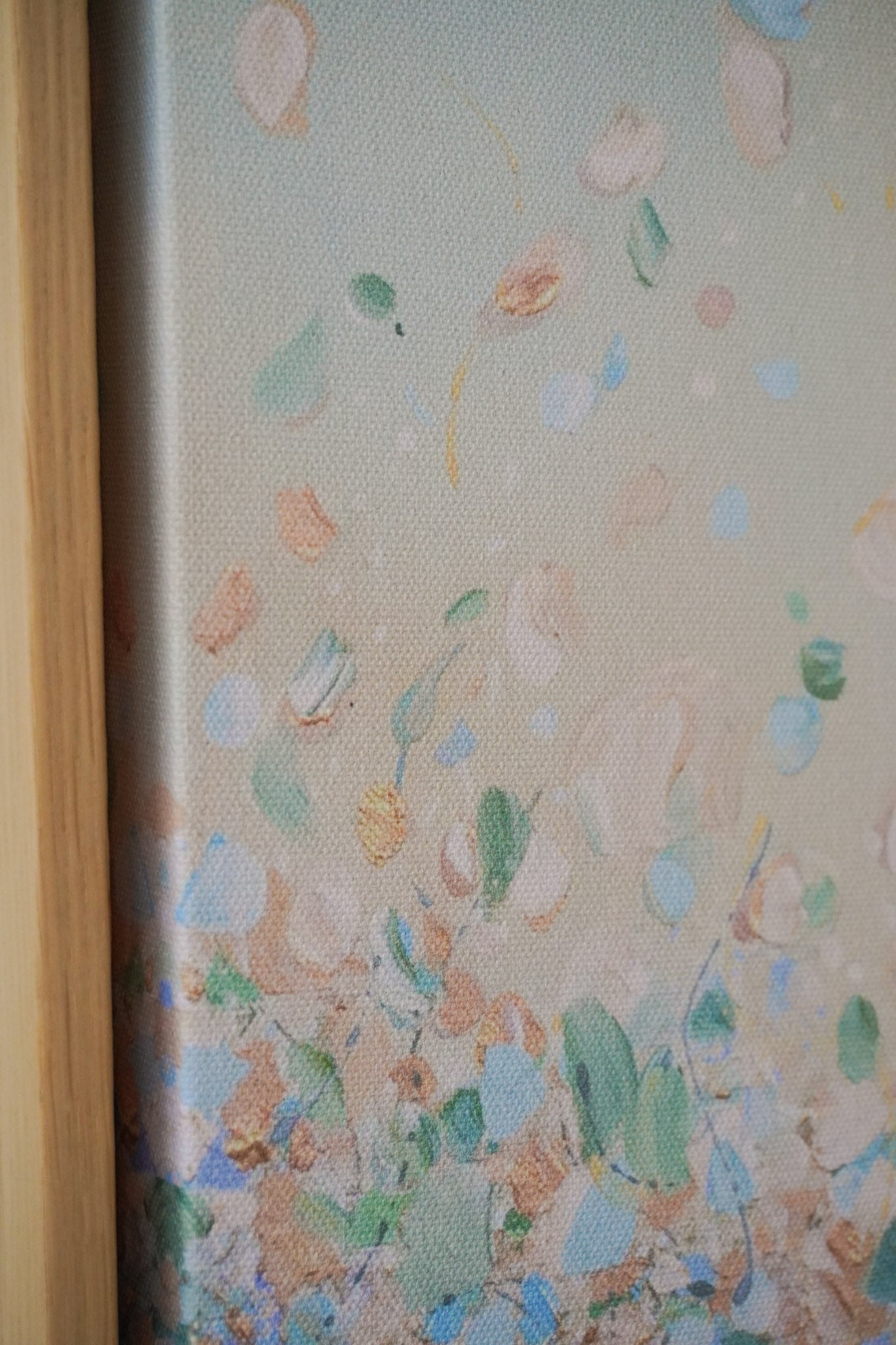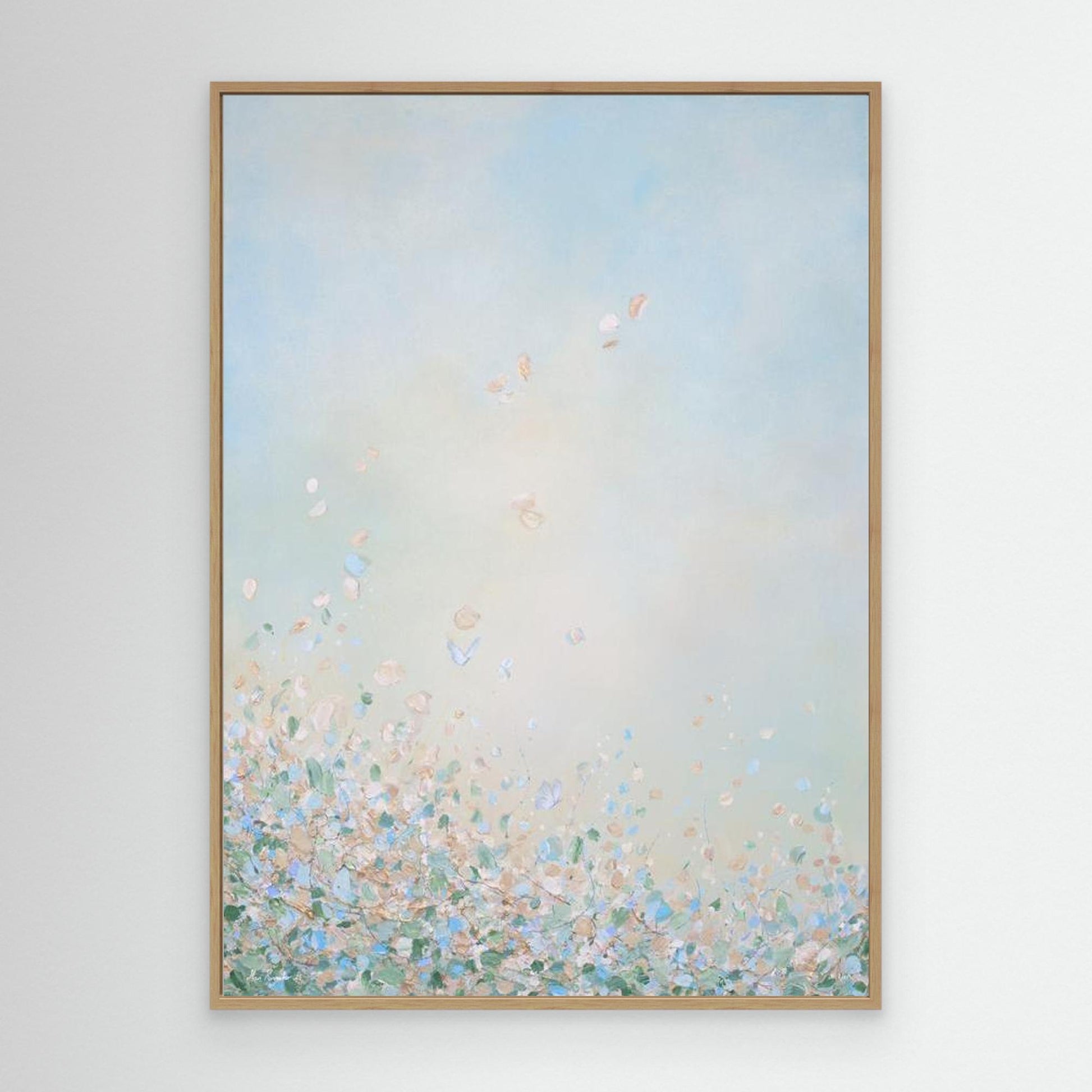 The edges of the canvas are mirrored. I highly recommend getting it with a floating frame, which will give the print an elevated, gallery-style appearance. The print “floats” inside a shadow gap frame, available in black, white, or oak. The oak frames are a beautiful oak veneer on solid wood. Everything arrives fully assembled and ready to hang on a sawtooth hanger.