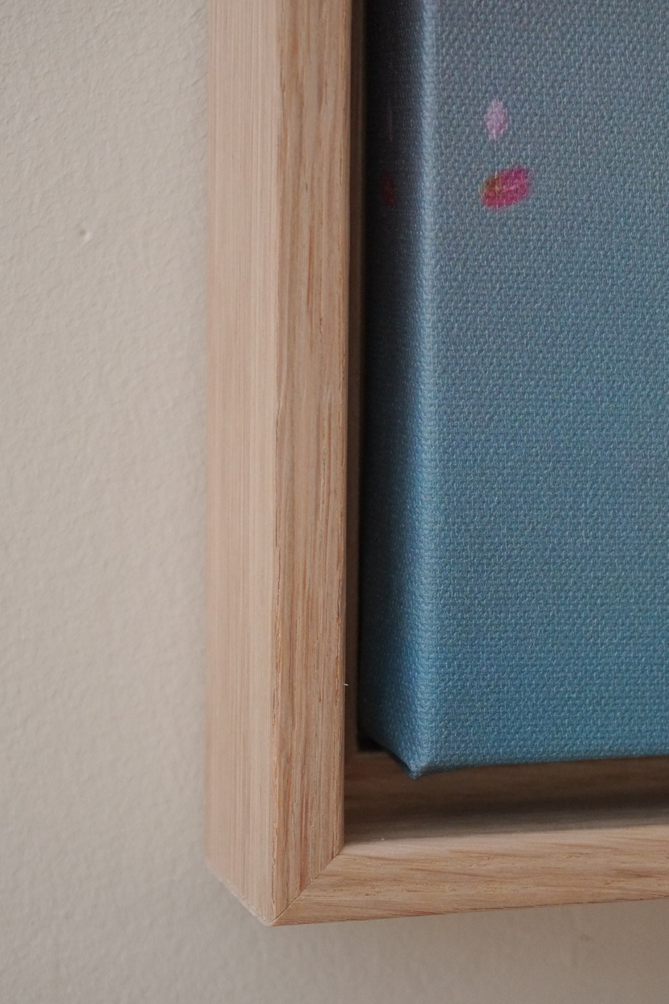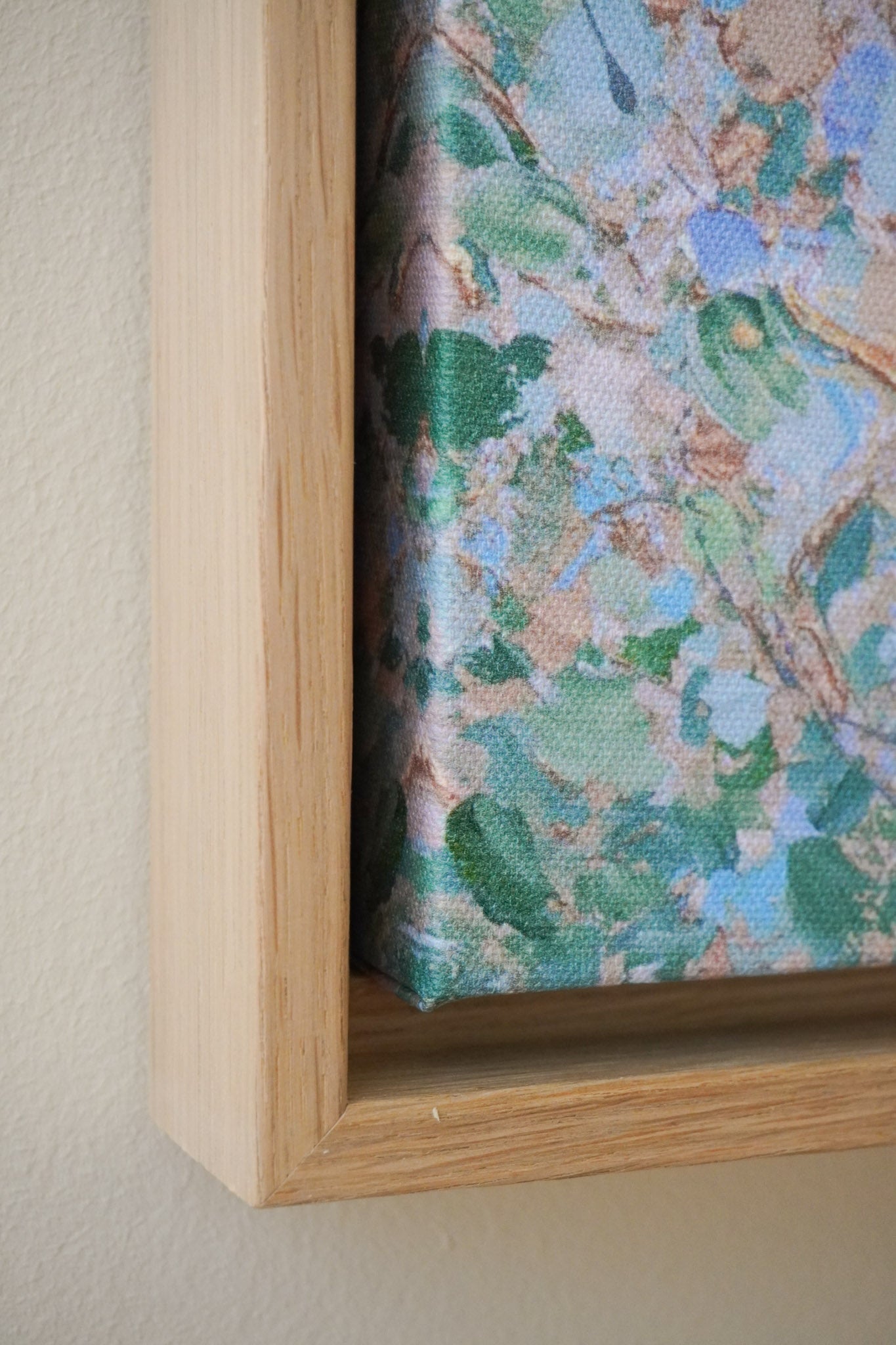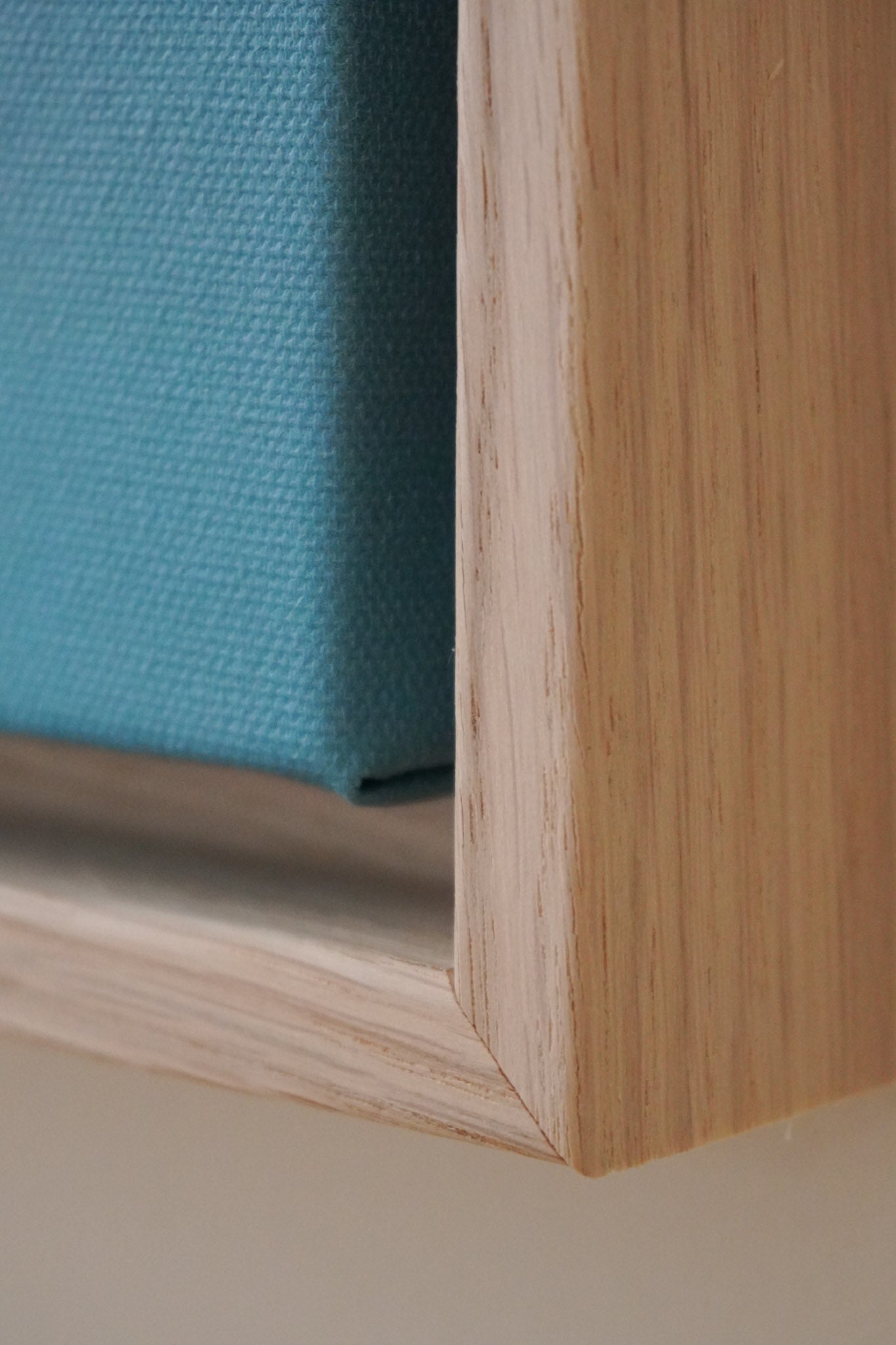 The floater frames are 3,2 cm deep. The oak frame is made from solid wood with oak veneer on top. The floating frame gives your canvas the appearance of floating within the frame.