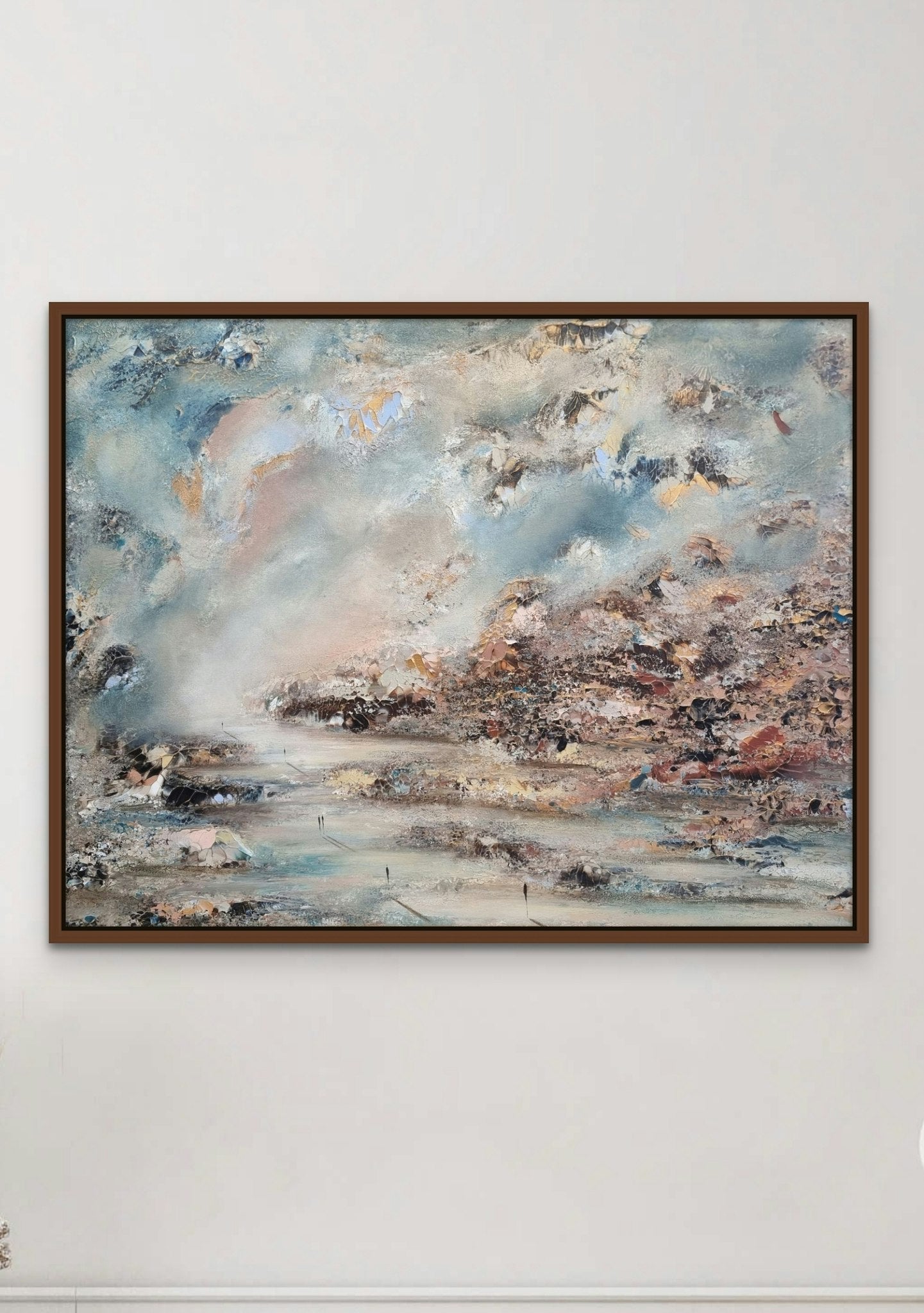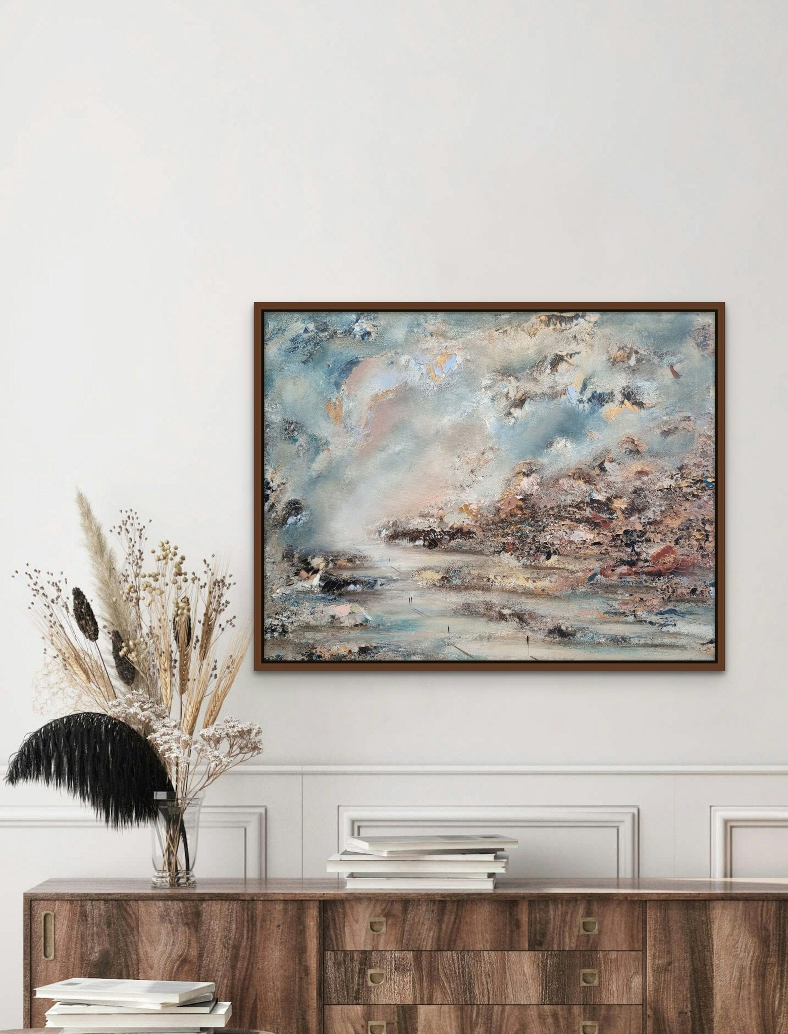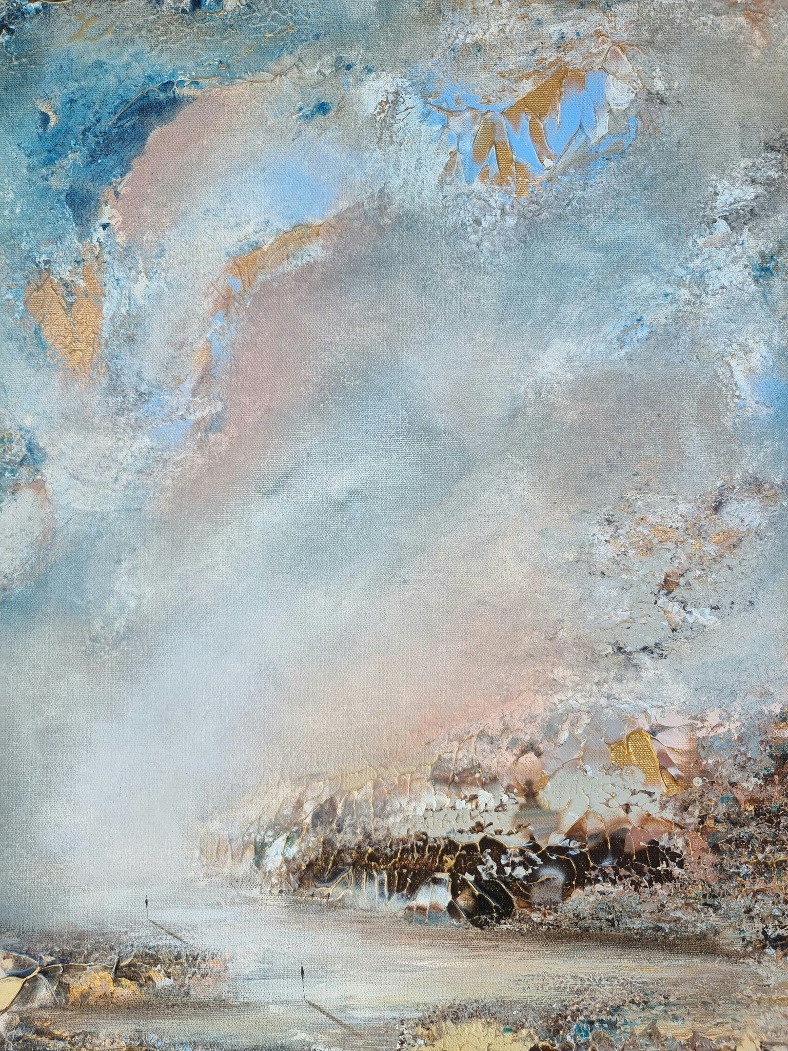 This painting is part of a pair that was created together. They have a similar structure that mirror one another, but I've played around with different colors for the sky and landscape which creates a different ambiance in the two paintings. In this one I've used darker and cooler colors, which I think creates a more dramatic atmosphere. It personally gives me a sense of the sun coming back just after the rain on a stormy day.