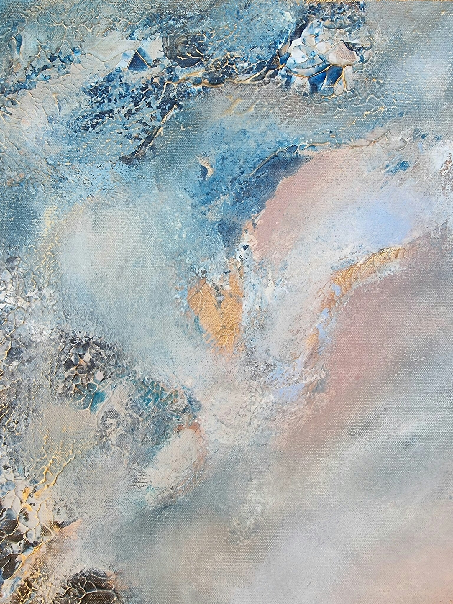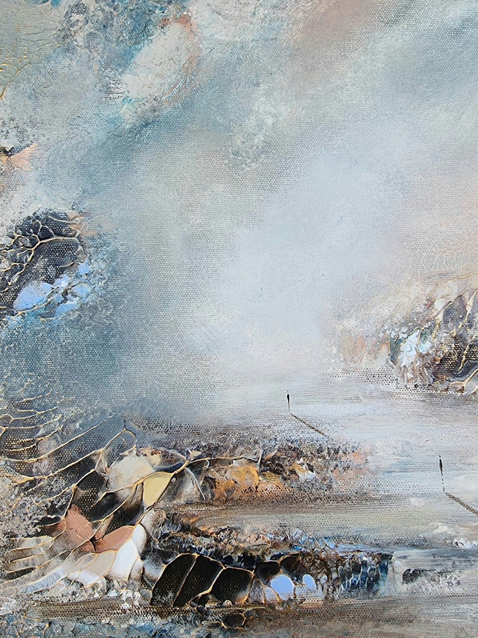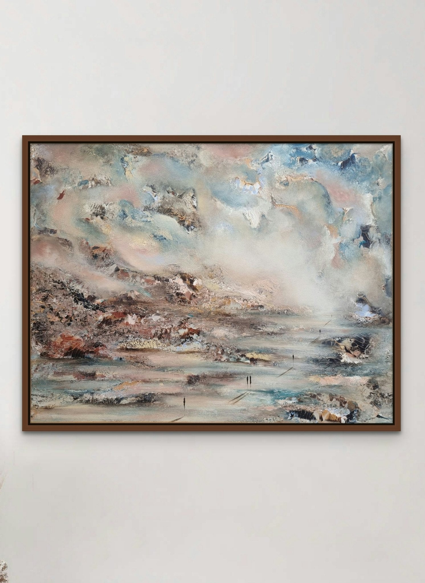 This painting is part of a pair that was created together. They have a similar structure that mirror one another, but I've played around with different colors for the sky and landscape which creates a different ambiance in the two paintings. In this one I've used darker and cooler colors, which I think creates a more dramatic atmosphere. It personally gives me a sense of the sun coming back just after the rain on a stormy day.