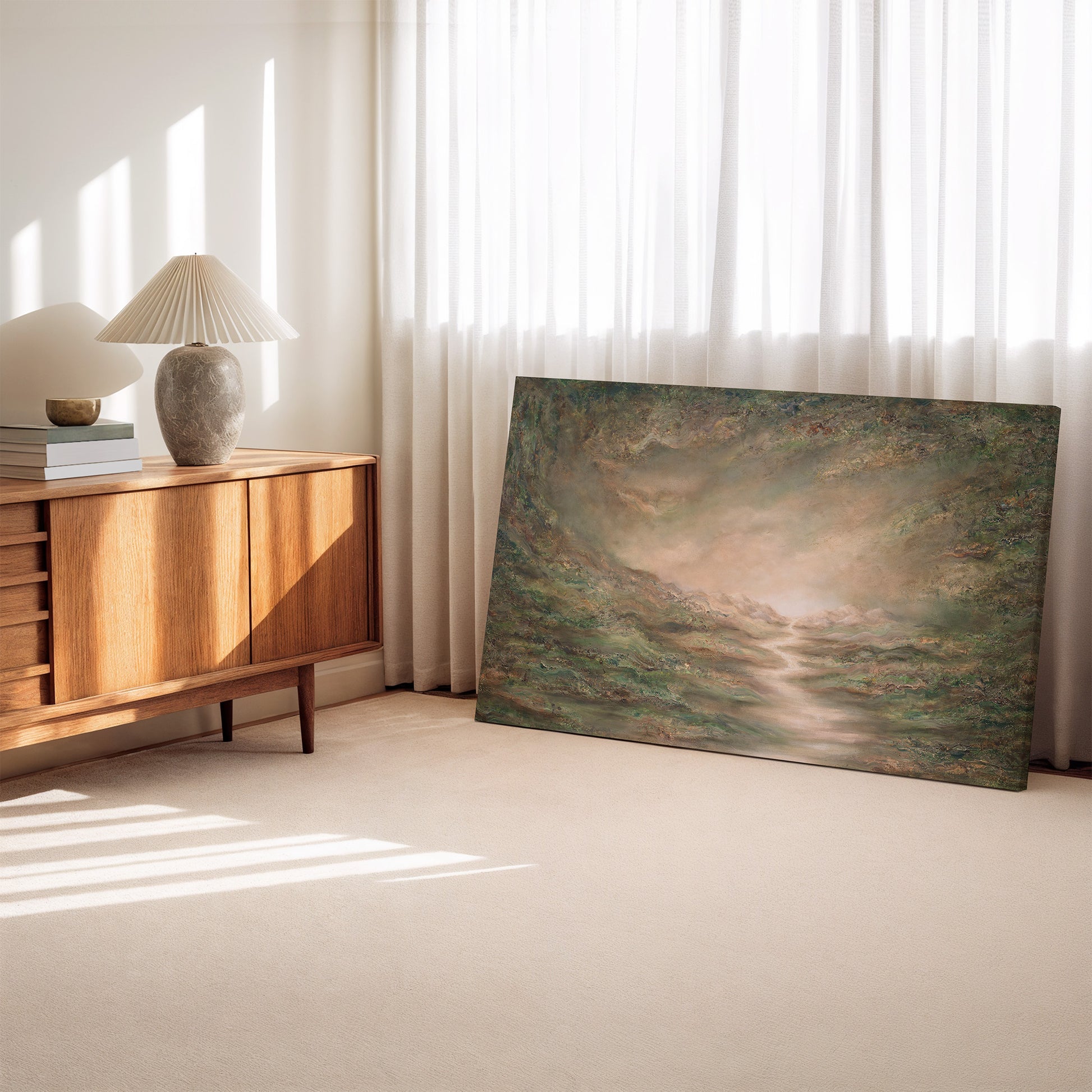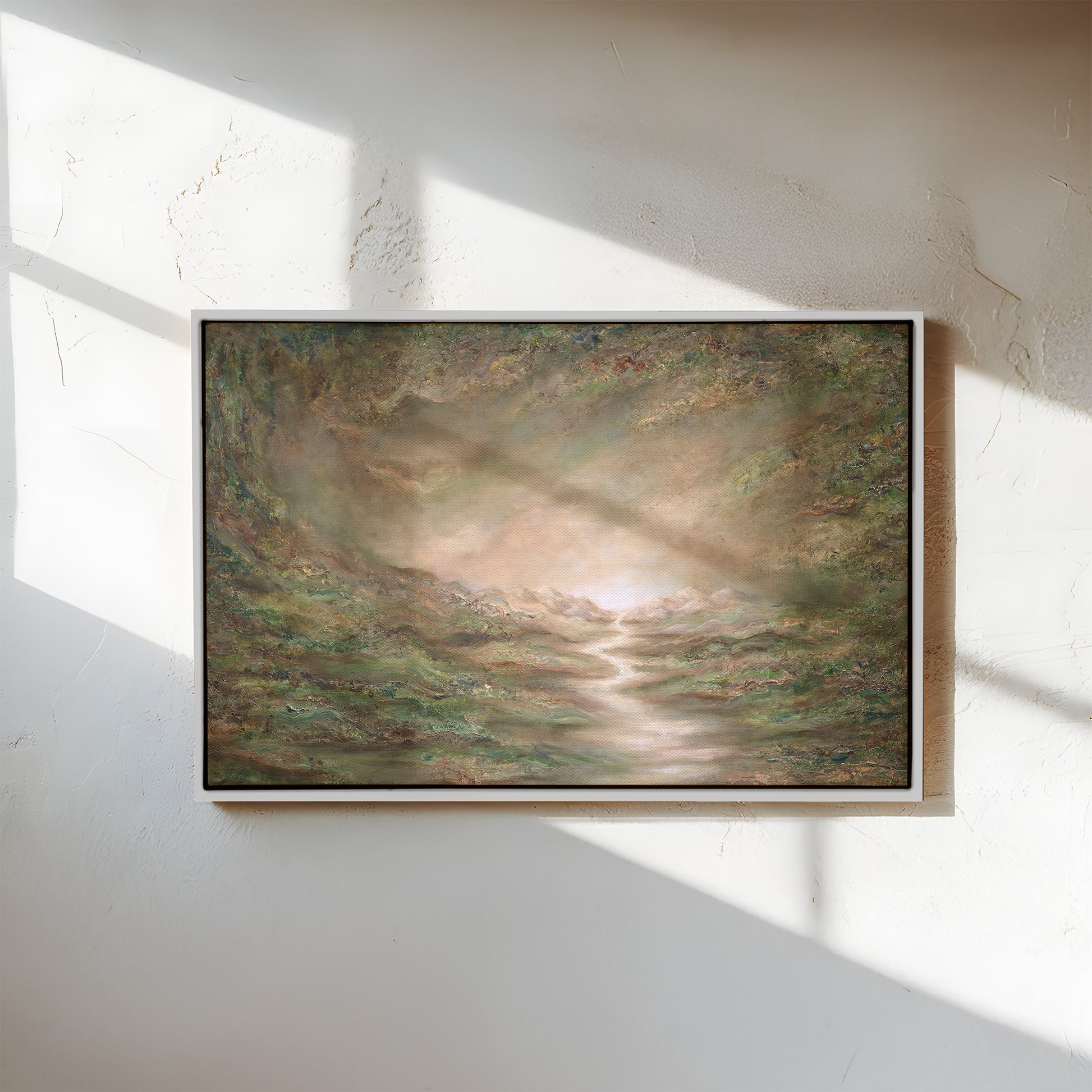 The edges of the canvas are mirrored. I highly recommend getting it with a floating frame, which will give the print an elevated, gallery-style appearance. The print “floats” inside a shadow gap frame, available in black, white, or oak. The oak frames are a beautiful oak veneer on solid wood. Everything arrives fully assembled and ready to hang on a sawtooth hanger.
