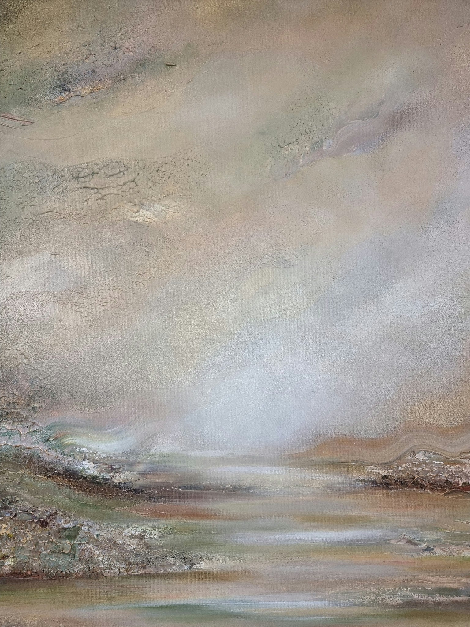 "Solitude" explores the ambiguity of aloneness. Solitude can at times be a lonley feeling, feeling isolated and out of connection with others. On the other hand solitude can also be a deeply needed experience of introspection and connecting with oneself. The palette is dominated by muted tones, which together with the soft light create a sense of the calm and quiet that can be felt in solitude.