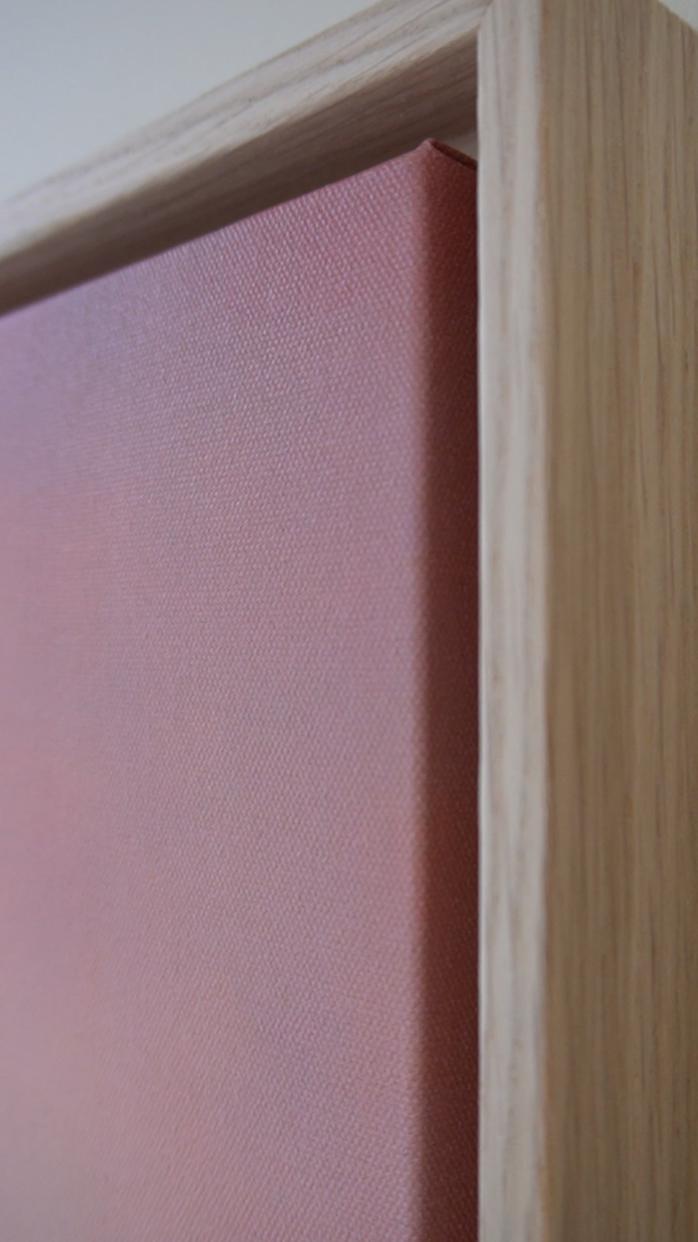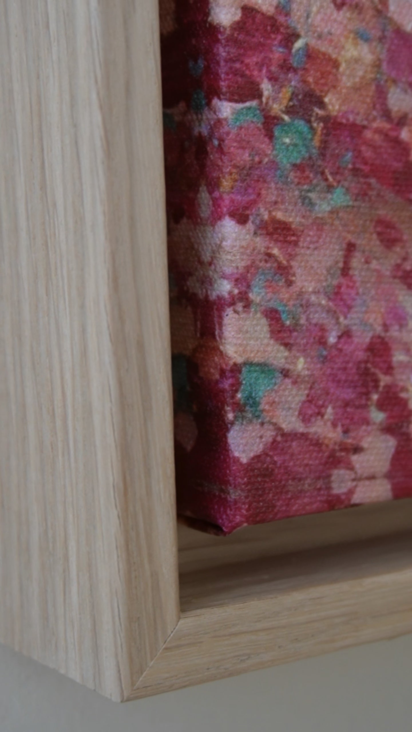 The floater frames are 3,2 cm deep. The oak frame is made from solid wood with oak veneer on top. The floating frame gives your canvas the appearance of floating within the frame.
