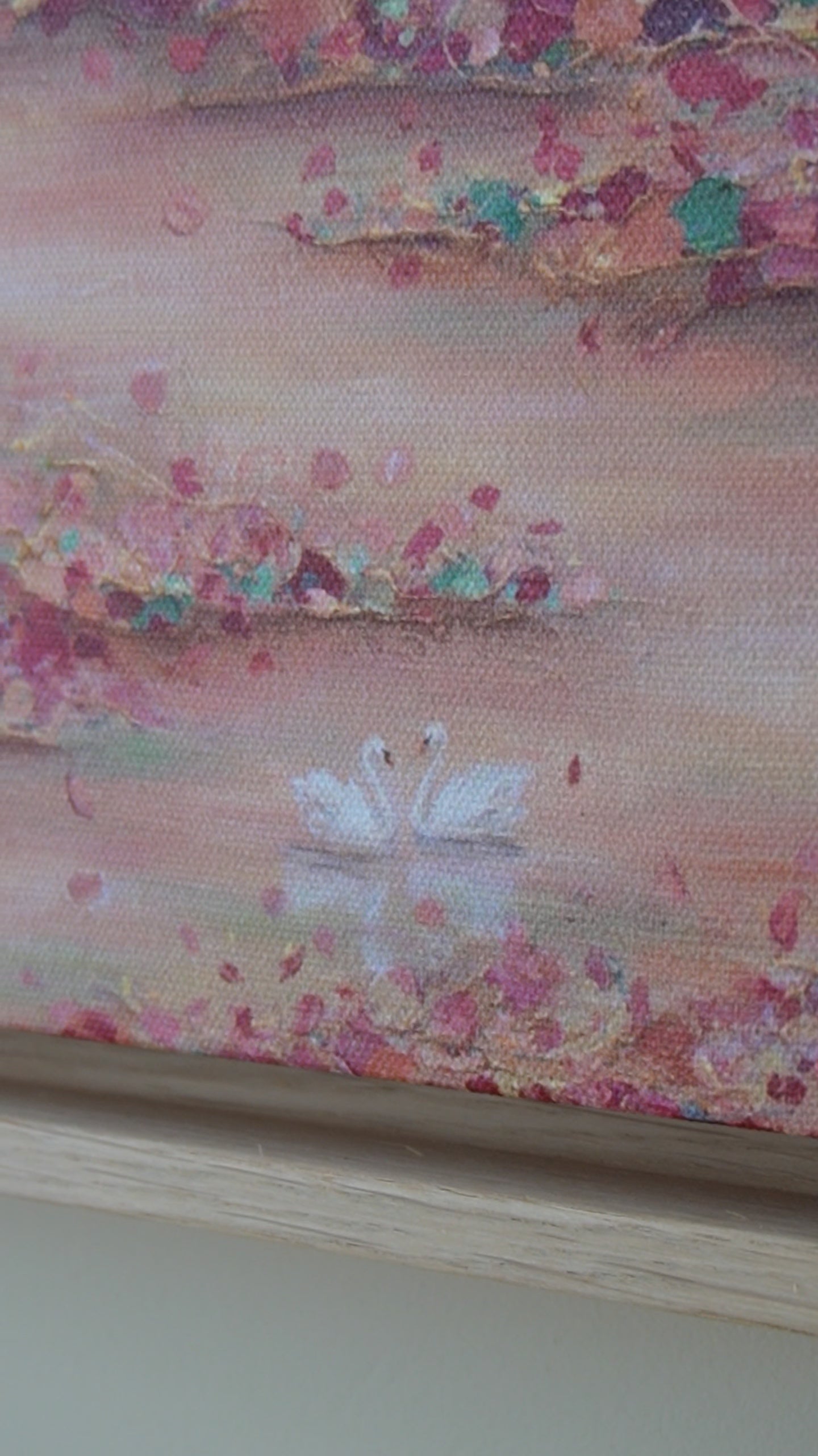 The edges of the canvas are mirrored. I highly recommend getting it with a floating frame, which will give the print an elevated, gallery-style appearance. The print “floats” inside a shadow gap frame, available in black, white, or oak. The oak frames are a beautiful oak veneer on solid wood. Everything arrives fully assembled and ready to hang on a sawtooth hanger.